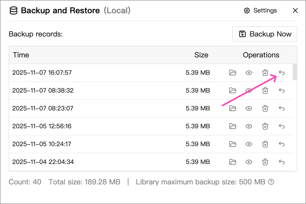 Don’t panic when encountering this problem. WonderPen has built-in automatic data backup enabled by default. Database corruption will not affect existing backup files, and you can restore data from backups at any time.