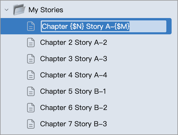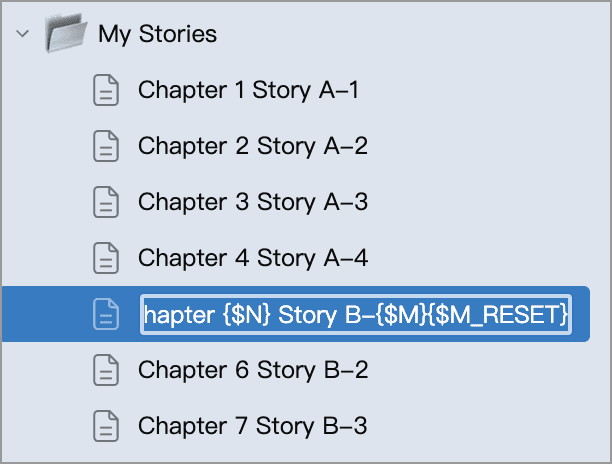 In version 3.0, we introduced a second numbering code {$M}, which you can use to number the second number in chapters. For example, 第{$N}章 小故事A {$M} will be rendered as 第1章 小故事A 1 based on its position.