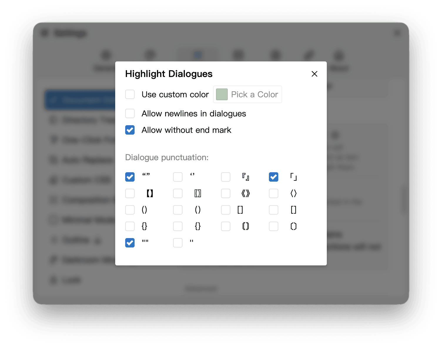 Section titled “Custom Settings”In Settings, you can also set the color of the highlighted dialogue, the identifier of the dialogue, and so on.