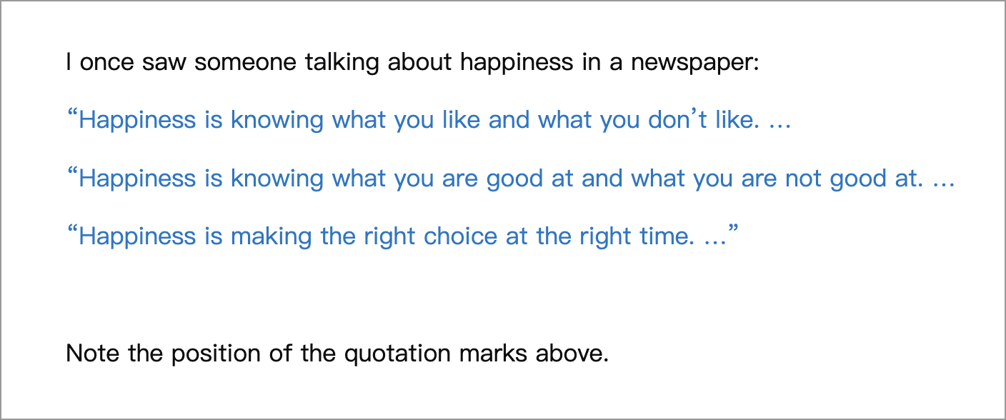 4.8.3.5 If a quotation that forms an independent paragraph has only one paragraph, both the beginning and end of the paragraph use quotation marks; if there is more than one paragraph, only the opening quotation mark is used at the beginning of each paragraph, and only the closing quotation mark is used at the end of the last paragraph.
