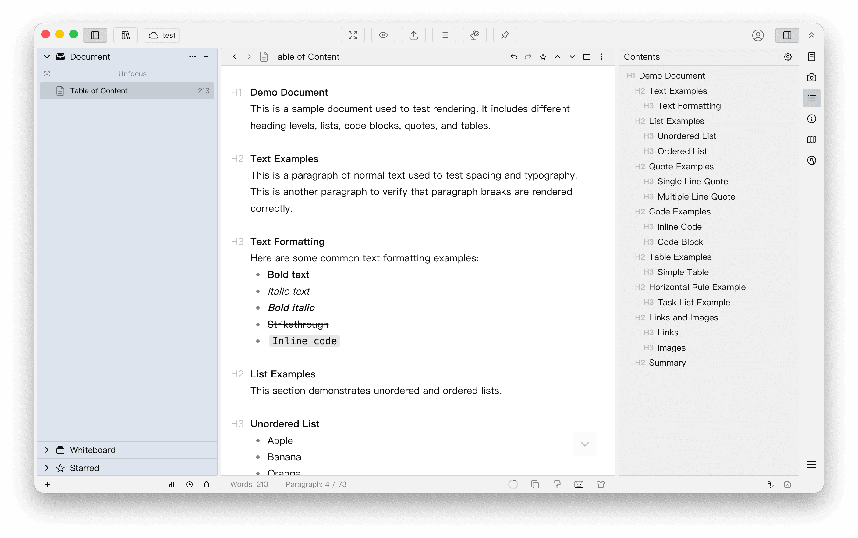 Click an item in the table of contents on the right, and the editor content will scroll to the corresponding position. This feature can be especially useful if your document is long.