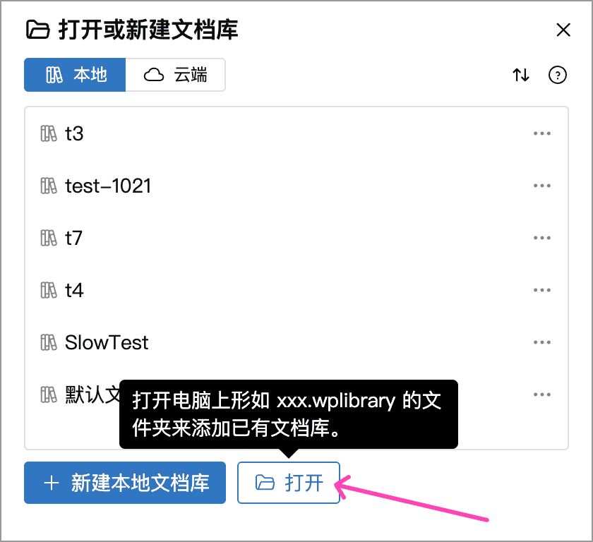 Section titled “本地文档库改名”本地文档库就是当前设备上的普通文件夹,一般以 .wplibrary 结尾。如果想给文档库改名,或者移动位置,可以遵循以下操作步骤: