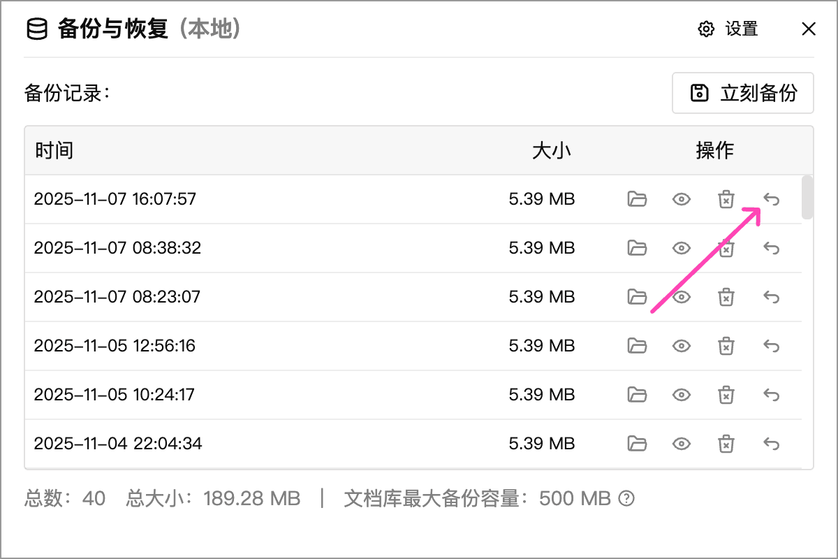 遇到这个问题不用紧张,WonderPen 内置并默认开启了数据自动备份功能,数据库损坏不会影响已有的备份文件,你随时可以从备份中恢复数据。