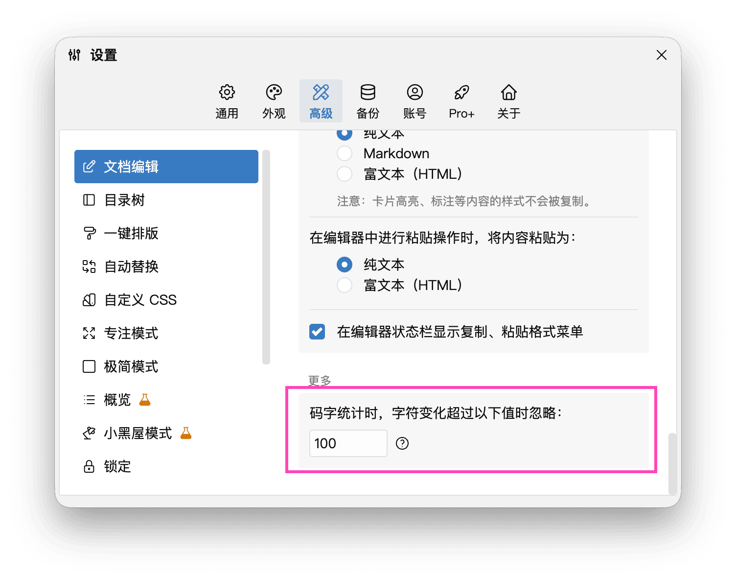 这个阈值默认值是 100,表示如果某次粘贴或删除操作所影响的内容的字符数超过 100,则这次操作将不计入码字统计。
