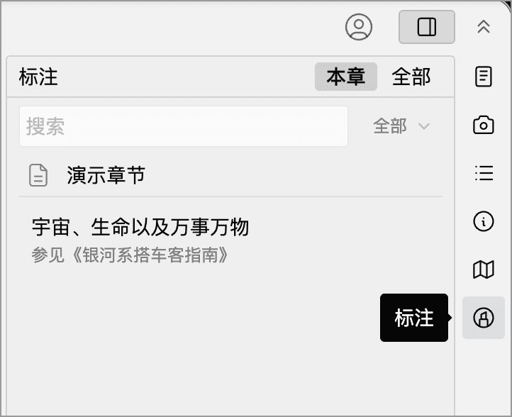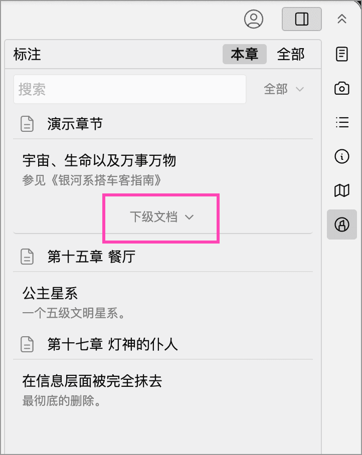 Section titled “查看下级文档标注”在本章模式下,如果当前文档包含下级文档,标注列表底部会显示下级文档入口。点击后,可展开或收起下级文档中的标注。