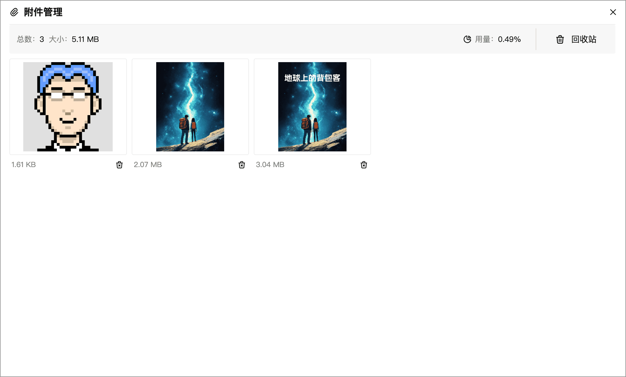 附件管理窗口会以网格形式显示附件缩略图,并在顶部显示附件数量、总大小等信息。云端文档库还会显示当前附件空间使用情况。